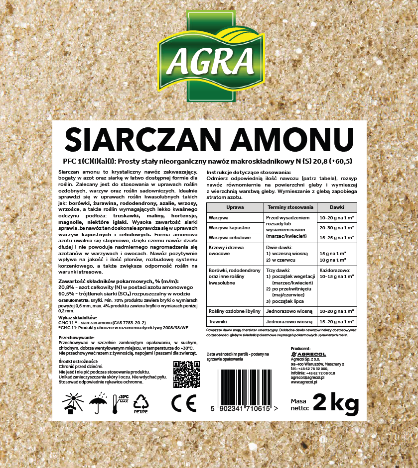 Siarczan amonu to krystaliczny nawóz zakwaszający, bogaty w azot oraz siarkę w łatwo dostępnej formie dla roślin. Zalecany jest do stosowania w uprawach roślin ozdobnych, warzyw oraz roślin sadowniczych. Idealnie sprawdzi się w uprawach roślin kwasolubnych takich jak: borówki, żurawina, rododendrony, azalie, wrzosy, wrzośce, a także roślin wymagających lekko kwaśnego odczynu podłoża: truskawki, maliny, hortensje, magnolie, niektóre iglaki. Wysoka zawartość siarki sprawia, że nawóz ten doskonale sprawdza się w uprawach warzyw kapustnych i cebulowych. Forma amonowa azotu uwalnia się stopniowo, dzięki czemu nawóz działa dłużej i nie powoduje nadmiernego nagromadzenia się azotanów w warzywach i owocach. Nawóz pozytywnie wpływa na jakość i ilość plonów, rozbudowę systemu korzeniowego, a także zwiększa odporność roślin na warunki stresowe.
