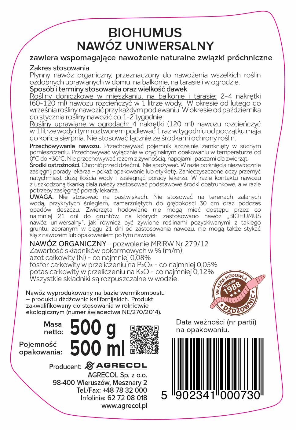 Biohumus nawóz uniwersalny to płynny nawóz organiczny. Przeznaczony do nawożenia wszelkich roślin ozdobnych uprawianych w domu, na balkonie, na tarasie i w ogrodzie. Nawóz powstaje w wyniku przetworzenia substancji organicznej przez dżdżownice kalifornijskie. Nawóz ten jest zakwalifikowany do stosowania w uprawach ekologicznych. Pełnowartościowy skład wzbogaca podłoże oraz poprawia jego strukturę, dzięki czemu rośliny mają zapewnione doskonałe warunki wzrostu i rozwoju. Nawóz ten jest zakwalifikowany do stosowania w uprawach ekologicznych.