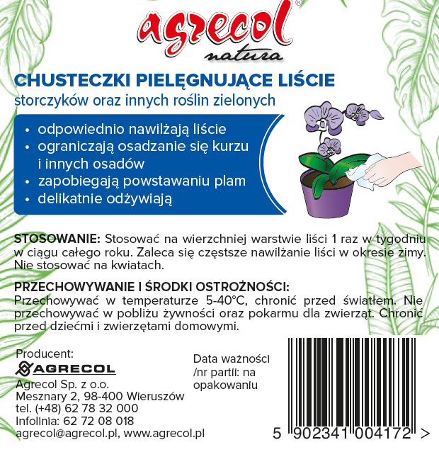 Wilgotne pielęgnacyjne chusteczki do storczyków oraz innych roślin ozdobnych z liści. Służą do regularnego czyszczenia atrakcyjnych liści storczyków. Chusteczki odpowiednio nawilżają liście, ograniczają osadzanie się kurzu i innych osadów, zapobiegają powstawaniu plam oraz delikatnie odżywiają. Do stosowania w ciągu całego roku. Chusteczki usuwają wszelkie zanieczyszczenia z liści: pyły, kurz oraz osady powstałe wskutek pryskania roślin twardą nieodstaną wodą.