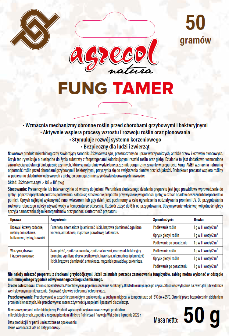 Nawozowy produkt mikrobiologiczny zawierający zarodniki Trichoderma spp., przeznaczony do upraw warzywniczych, a także drzew i krzewów owocowych. Grzyb ten rywalizuje o niezbędne do życia substraty z fitopatogenami kolonizującymi resztki roślin oraz glebę. Działanie to jest dodatkowo wzmocnione zawartością substancji biologicznie czynnych, które są naturalnie wydzielane przez mikroorganizmy zawarte w preparacie. Fung TAMER wzmacnia naturalną odporność roślin przed chorobami grzybowymi i bakteryjnymi, przyczynia się do zwiększenia plonów oraz ich jakości. Dodatkowo preparat wspiera rośliny w pobieraniu składników odżywczych z gleby, co pomaga zmniejszyć dawki stosowanych nawozów.