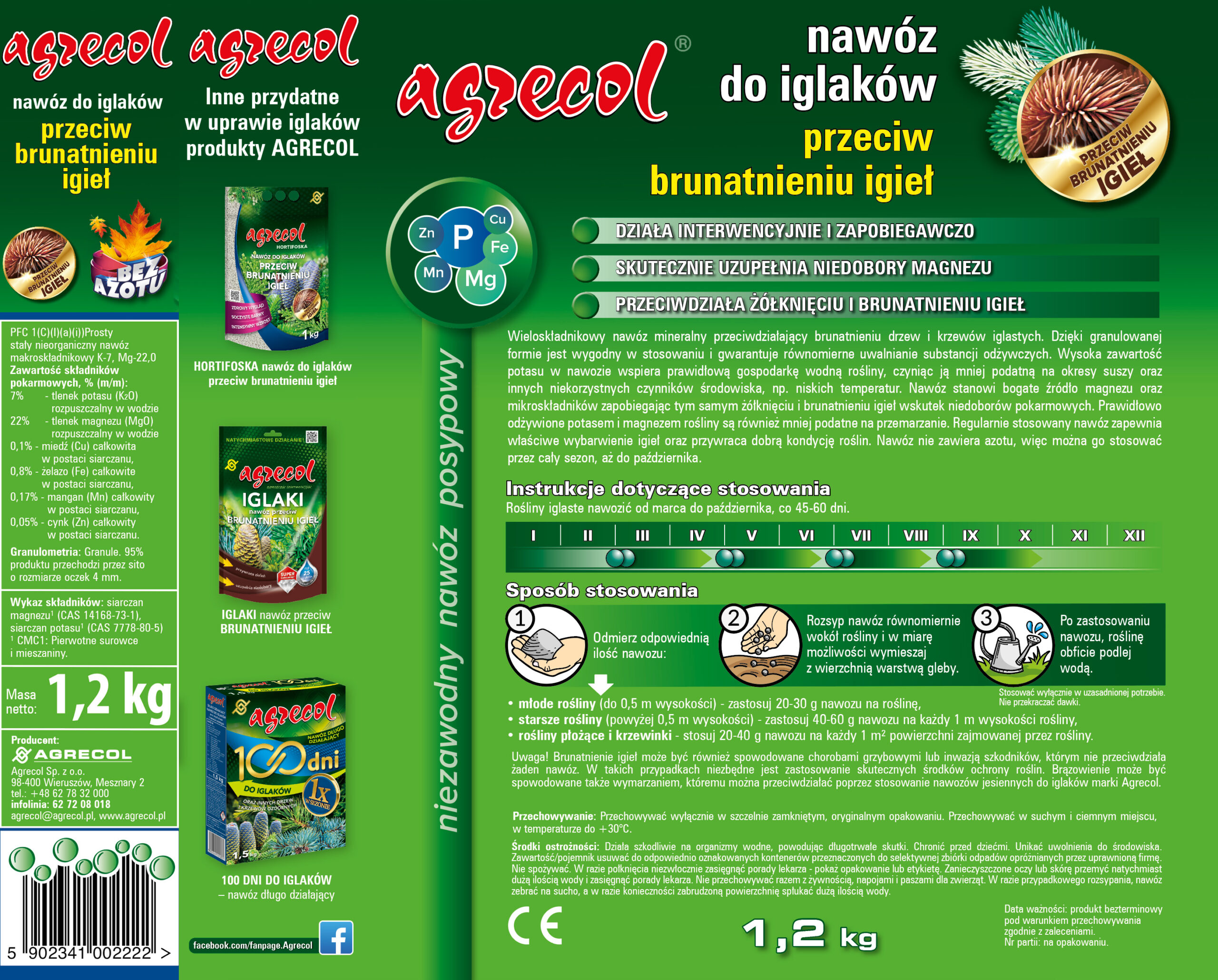 Nawóz do iglaków przeciw brunatnieniu igieł to wieloskładnikowy nawóz mineralny przeciwdziałający brunatnieniu drzew i krzewów iglastych. Dzięki granulowanej formie jest wygodny w stosowaniu i gwarantuje równomierne uwalnianie substancji odżywczych. Wysoka zawartość potasu w nawozie wspiera prawidłową gospodarkę wodną rośliny, czyniąc ją mniej podatną na okresy suszy oraz innych niekorzystnych czynników środowiska, np. niskich temperatur. Nawóz stanowi bogate źródło magnezu oraz mikroskładników zapobiegając tym samym żółknięciu i brunatnieniu igieł wskutek niedoborów pokarmowych. Prawidłowo odżywione potasem i magnezem rośliny są również mniej podatne na przemarzanie. Regularnie stosowany nawóz zapewnia właściwe wybarwienie igieł oraz przywraca dobrą kondycję roślin. Nawóz nie zawiera azotu, więc można go stosować przez cały sezon, aż do października.